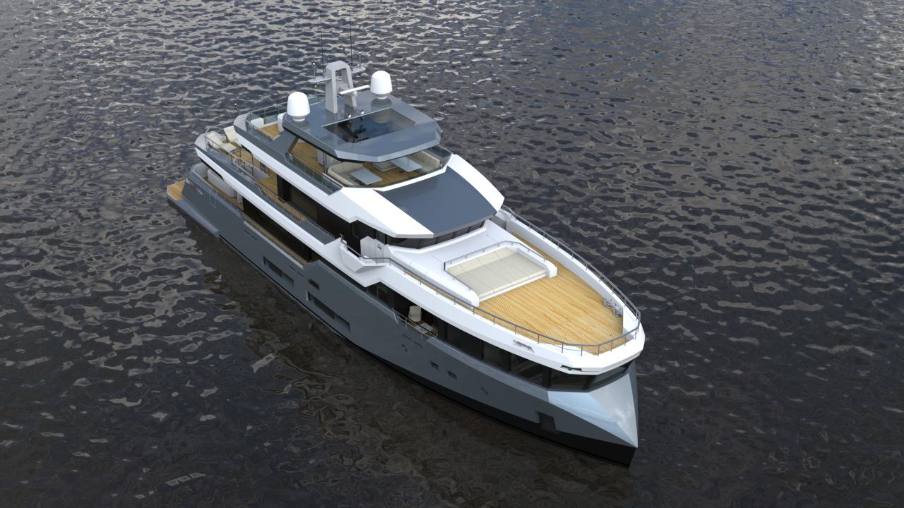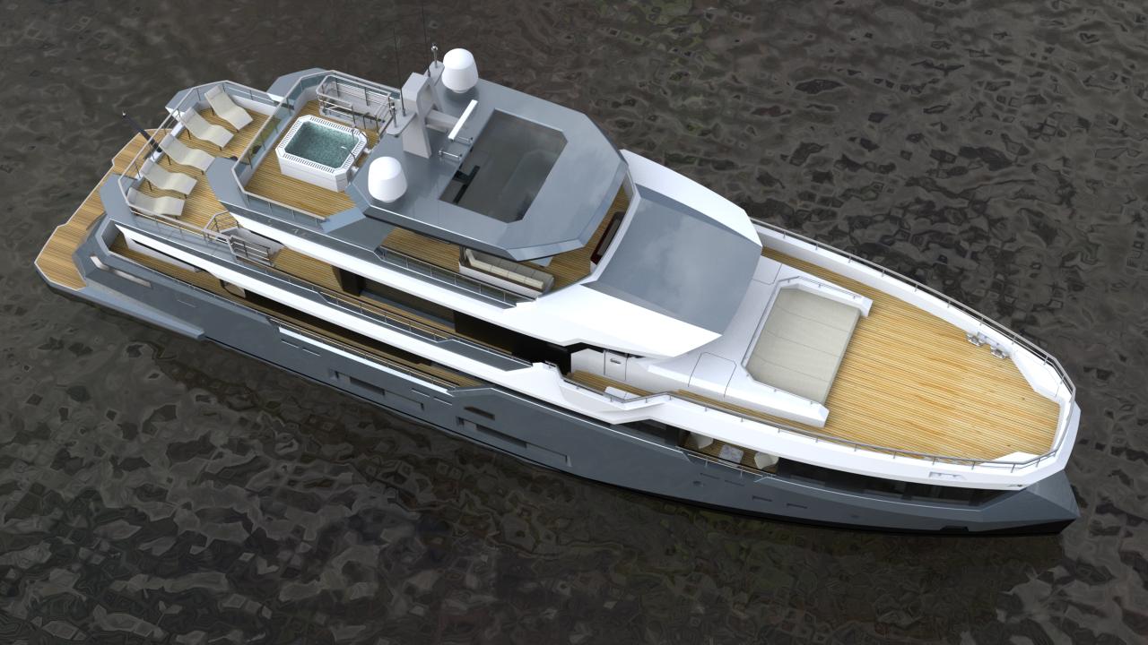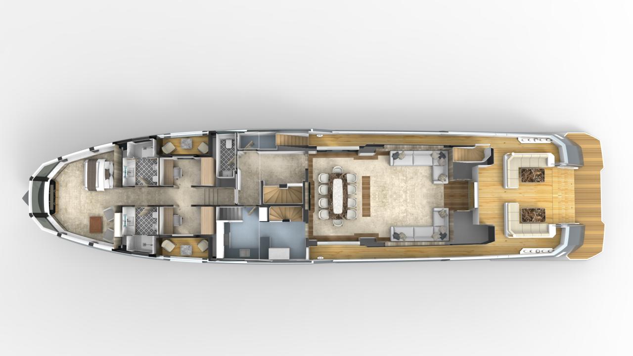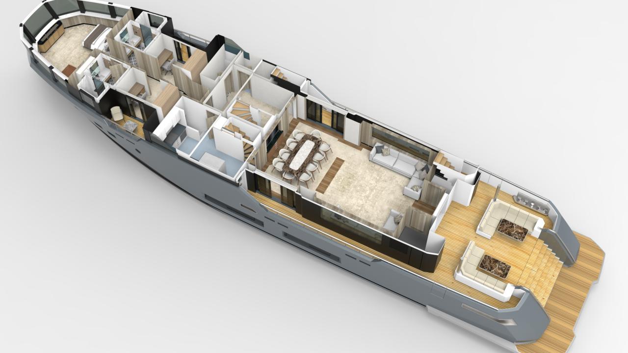 Thanks to this design, the boat owner is offered a forward-facing master cabin with a net usable area of 60 m2; and an uninterrupted 180° sea view.
